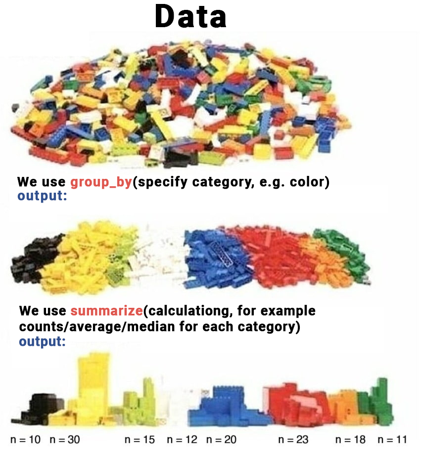 A tricky but helpful operation is groupping a variable, and then calculating statistics. This picture really helps me wrap my head around it.